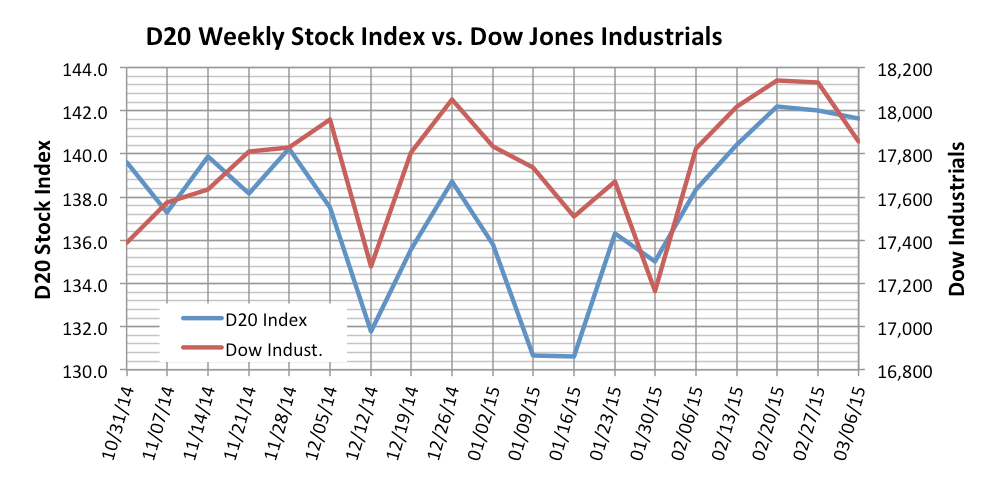The first full week of March proved to be the second consecutive down week for the Driverless Transportation D20 Stock Index as it lost 0.38 or 0.27 percent of its value to close at 141.65. The D20 continues to track the Dow Jones, which declined by 1.5 percent. D20 losers outnumbered gainers 12 to eight.